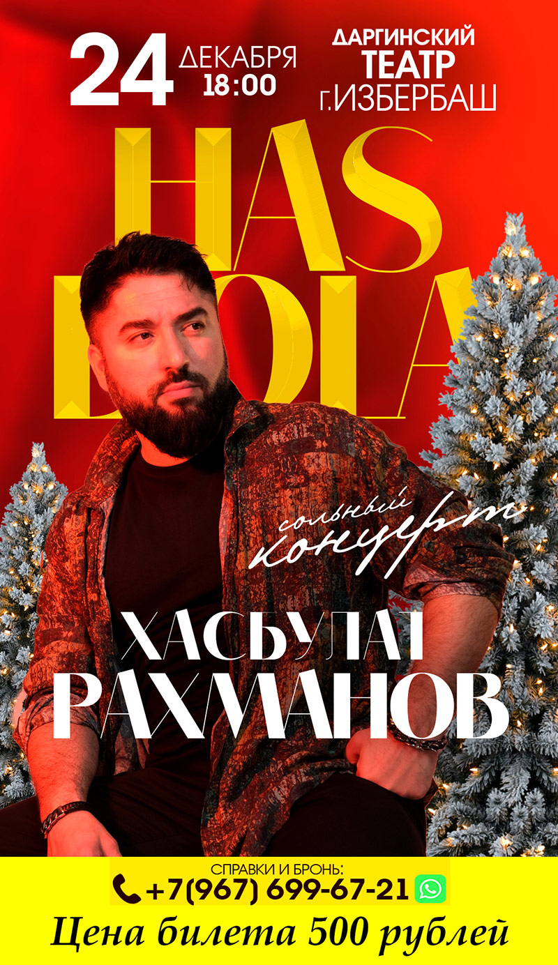 Совсем скоро Новый Год — время волшебства и подарков, а лучший подарок — концерт любимого певца и артиста Хасбулата Рахманова, который состоится 24 декабря! (начало в 18.00ч.)